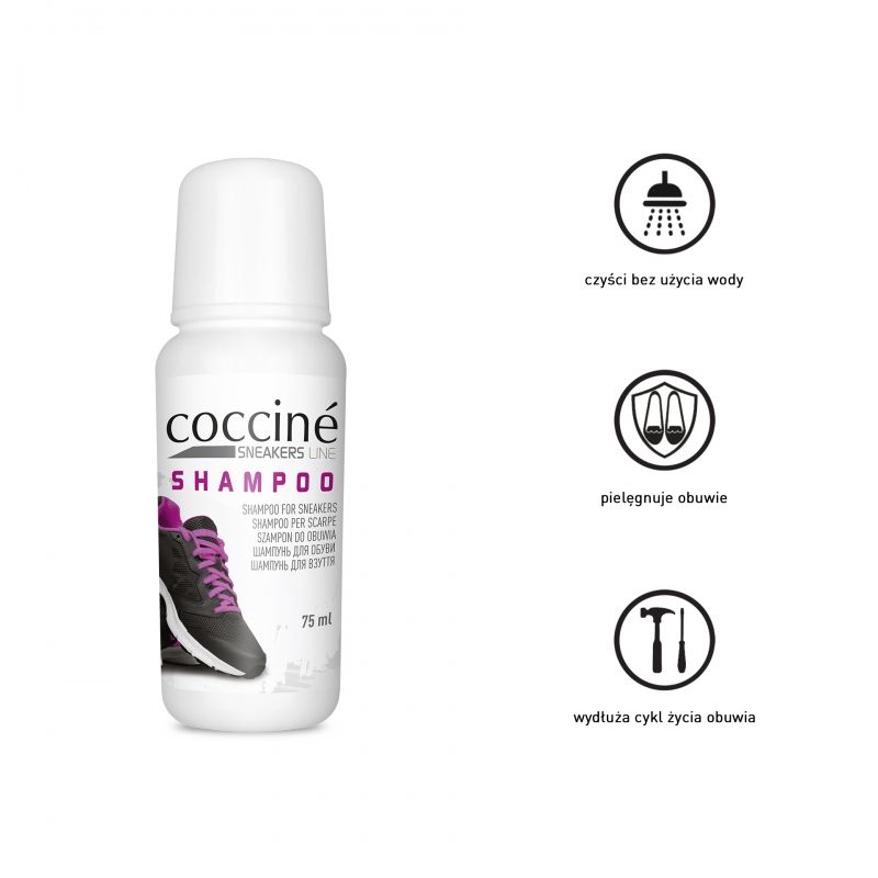 Coccine Shampoo Sneakers Line е безцветен шампоан за обувки, който бързо и ефикасно почиства кожа, текстил и велур. Предназначен е предимно за спортни обувки, които се използват интезивно при различни условия. Шампоанът Coccine лесно отстаранява всякакви замърсявания, които са навлезли в структурата на материала. Ефективната опаковка е достатъчна за многократна употреба, което ви позволява да се наслаждавате на чисти обувки за по-дълго време.