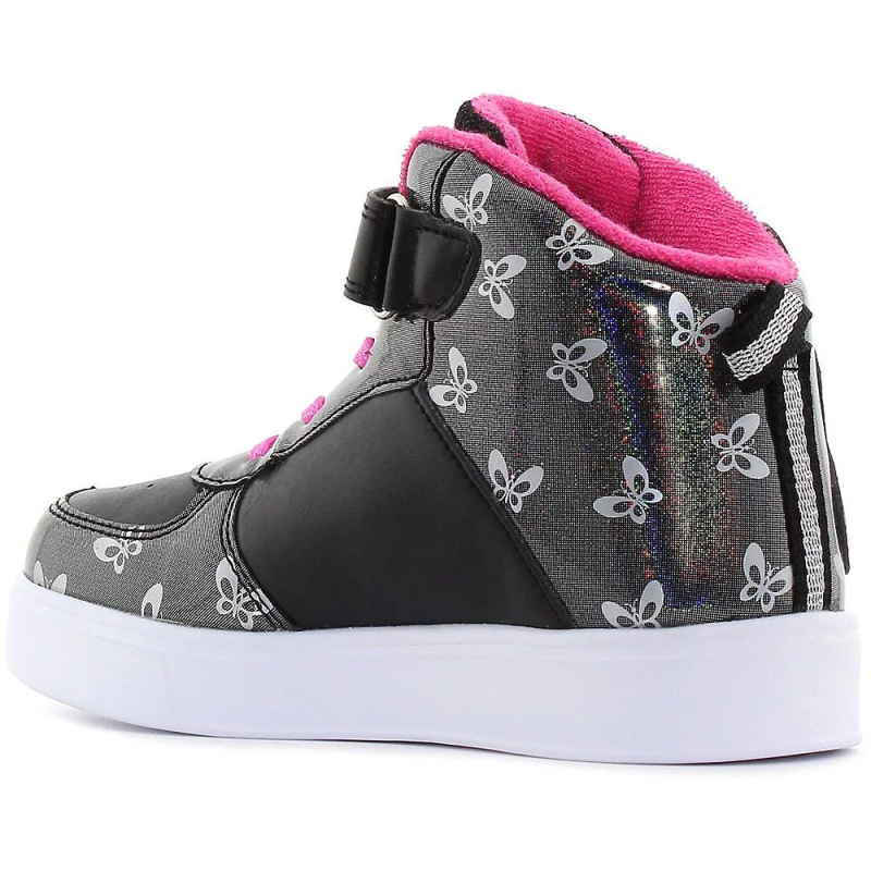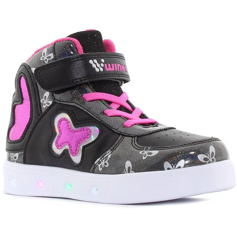 Светещи детски сникърси за момичета Wink в черен цвят – стилни и украсени с красиви цветни пеперуди! Тези модерни кецове са идеални за малките принцеси, които обичат да впечатляват с блясък и удобство. С LED светлини в подметката, които светят при всяка стъпка, тези ботушки са не само атрактивни, но и забавни за носене. Изработени от висококачествени материали, те осигуряват комфорт през целия ден. Ластичните връзки и каишката с велкро фиксират перфектно обувките към детското краче. Меката мемори стелка и стабилната подметка ги правят подходящи за игра, разходки и училище.