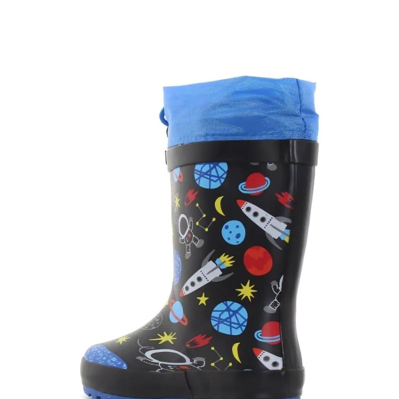 Подплатените гумени ботуши WINK AQQO SPACE са топли, водоустойчиви и създадени за малки космонавти. Синият космически дизайн с ракети е идеален за игри в дъжд, локви и студено време. 🚀🌧️