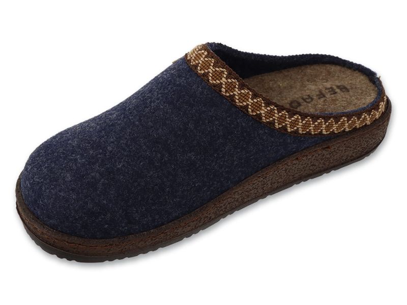 Луксозните анатомични домашни чехли Befado Home & Go 155D181 са изработени от топъл, дишащ тъмноосин филц и украсени с нежен ромбоиден кант. Моделът осигурява лекота, стабилност и комфорт благодарение на анатомичната подметка и антихлъзгащото ходило. Перфектен избор за уют и удобство у дома.