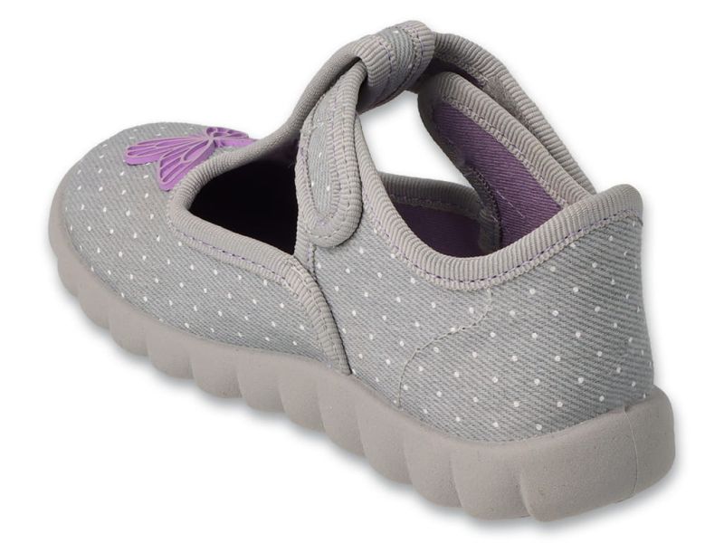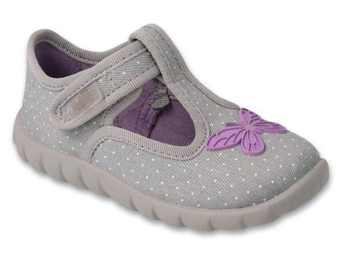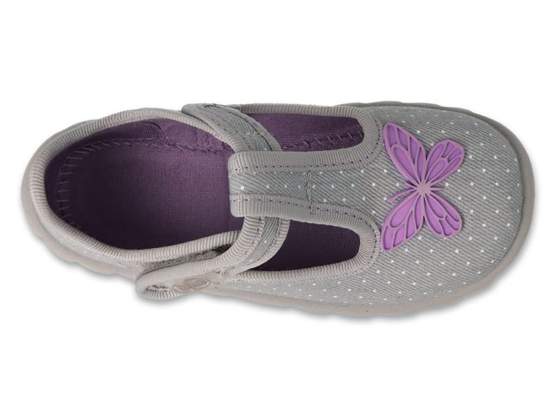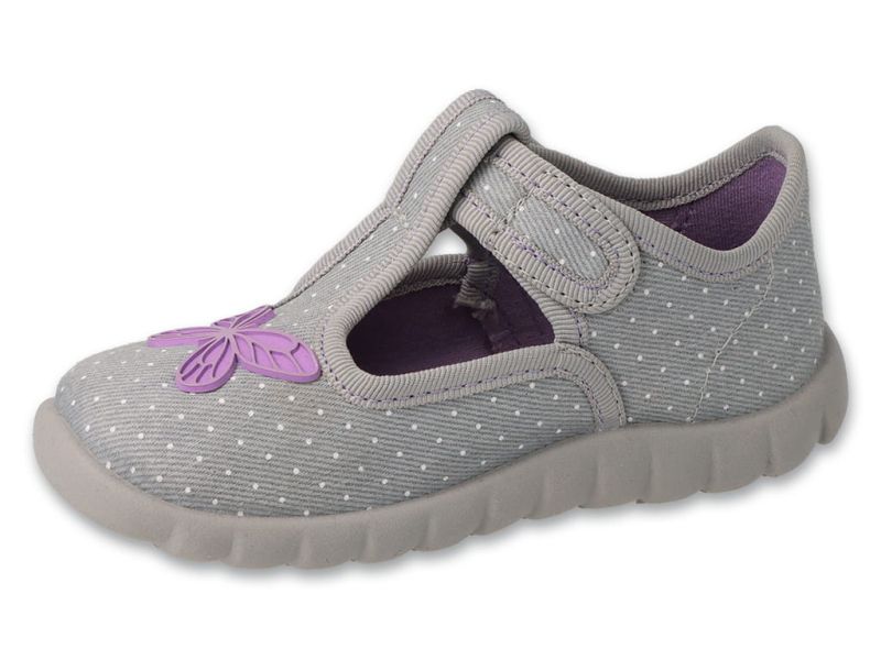 Befado Flexi B-soft System 627P004 са меки и изключително леки бебешки пантофки, създадени да подпомагат естественото движение на малкото краче. Моделът е в нежен сив цвят с бели точки и акцент – лилава пеперуда, която придава сладък и игрив вид.