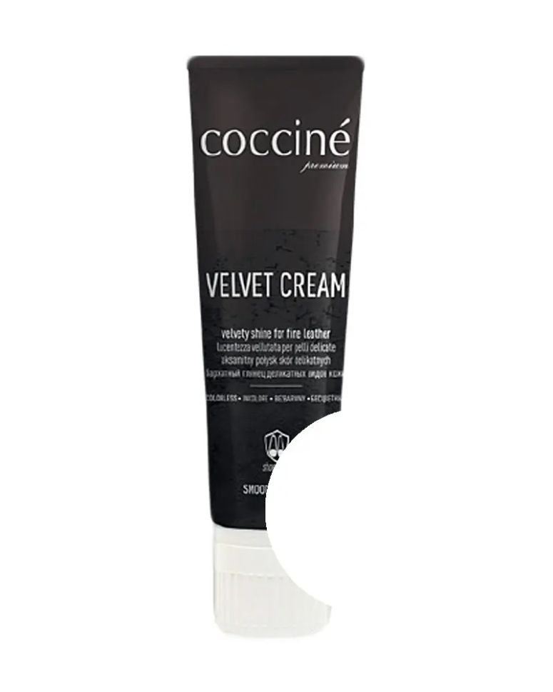 Coccinè Valvet cream Бял крем в туба с модерна формула, прeдназначен за благородна, деликатна кожа, която трудно се поддържа с традиционни средства. Препоръчва се за фина биволска кожа, склонна лесно да потъмнява и мека телешка кожа с копринени зърна. Тубичката с апликатор позволява лесно нанасяне на крема върху обувки, аксесоари, куфарчета и дамски чанти. Кремът придава красив кадифен блясък, не потъмнява абсорбиращите кожи, запазва оригиналния им вид, като същевременно ги покрива със защитен слой от восъци и смоли.
