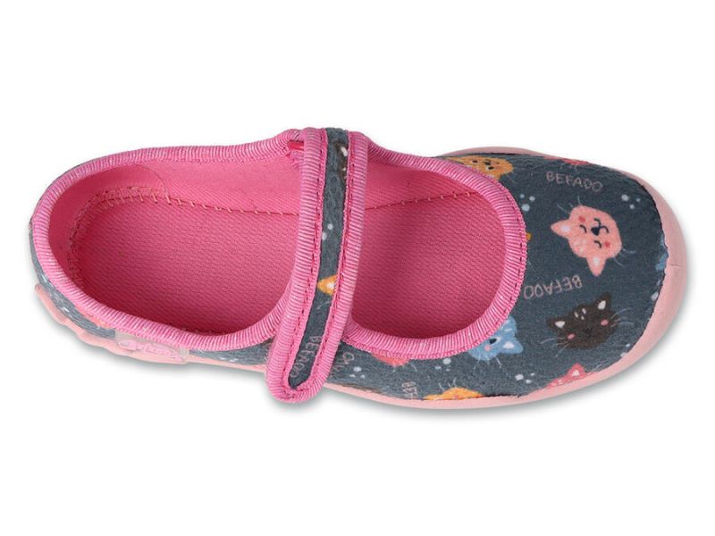 Детски текстилни пантофки Befado 114X537 в сив цвят със сладък принт котета. Леки и удобни, с практична лепенка за лесно обуване и стабилна противоплъзгаща подметка. Подходящи за детска градина и ежедневно носене.
