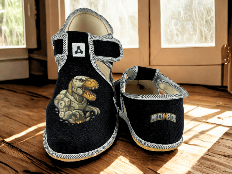 Rascal Mech-Rex Black Леки и гъвкави детски босоноги пантофи с широка предна част за естествено движение. Подходящи за детска градина, училище и у дома.