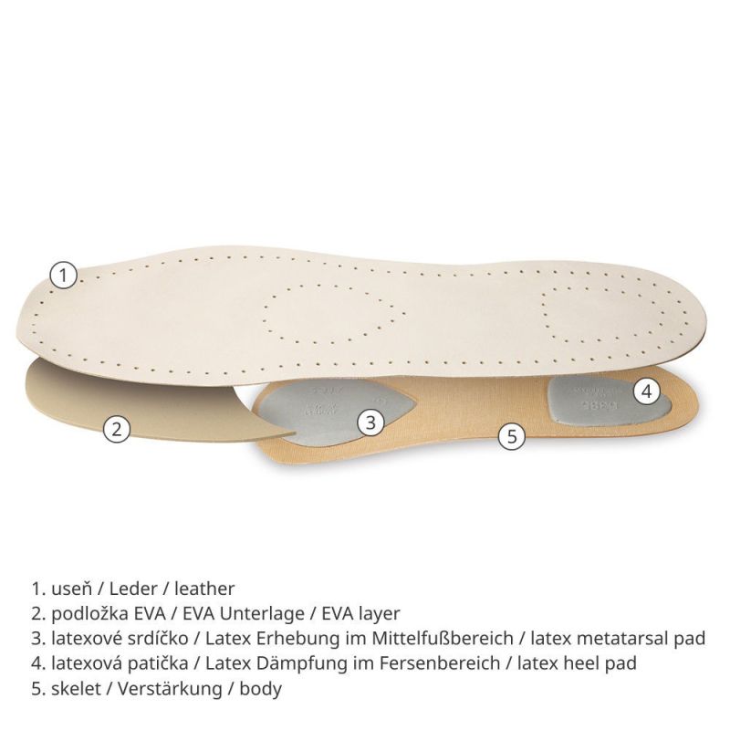 В областта на петата стелките са модифицирани с т.нар. латексово легло, което действа като мек протектор и осигурява допълнителна амортизация при стъпване. Това значително намалява натоварването върху петата и подобрява усещането при продължително ходене или стоене прав.