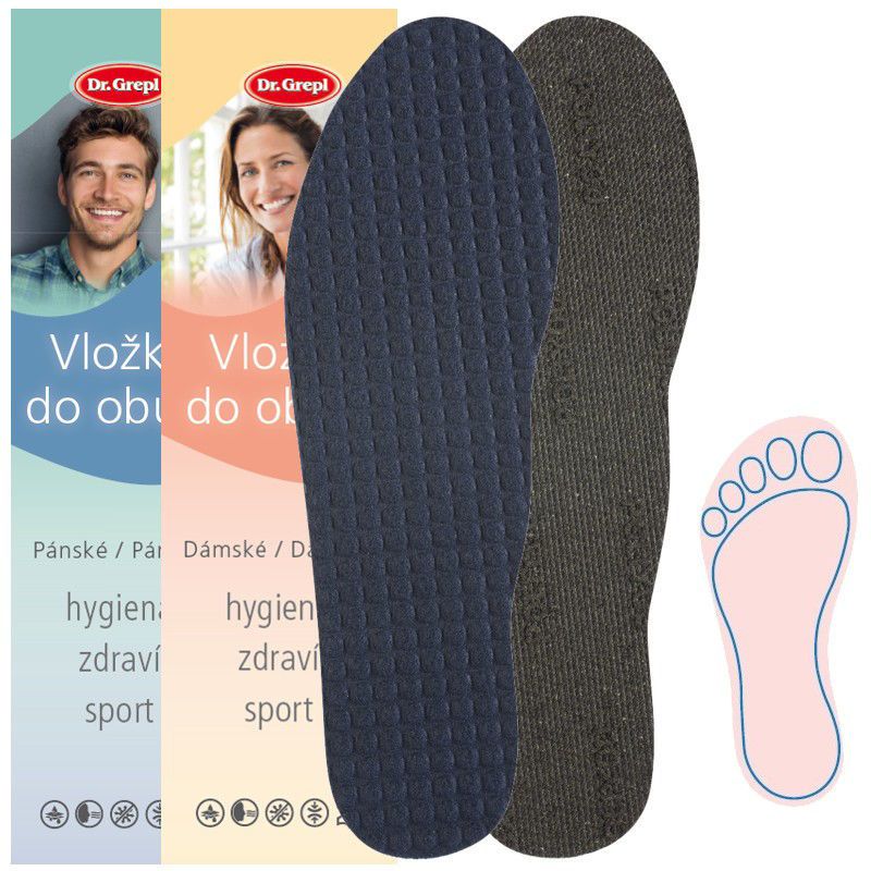 Антибактериални стелки Dr. Grepl CARBON с 3-слойна латексова структура и анатомична поддръжка на надлъжния и напречен свод за комфорт и стабилност при ходене.