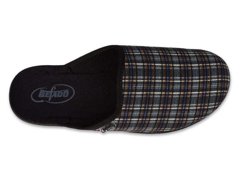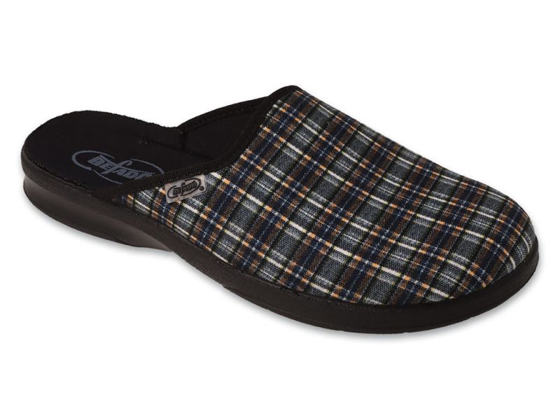 Домашните чехли Leon на полската марка Befado са подходящи за мъже от всички възрасти. Изработени са от високачествени памучни и ефирни материи, които се отличават с издържливост при дълга употреба. Ходилото е анатомично, в практичен тъмен цвят и не се мокри при стъпване на влажни повърхности. Горната част е в черен цвят с ефектено пъстро каре.