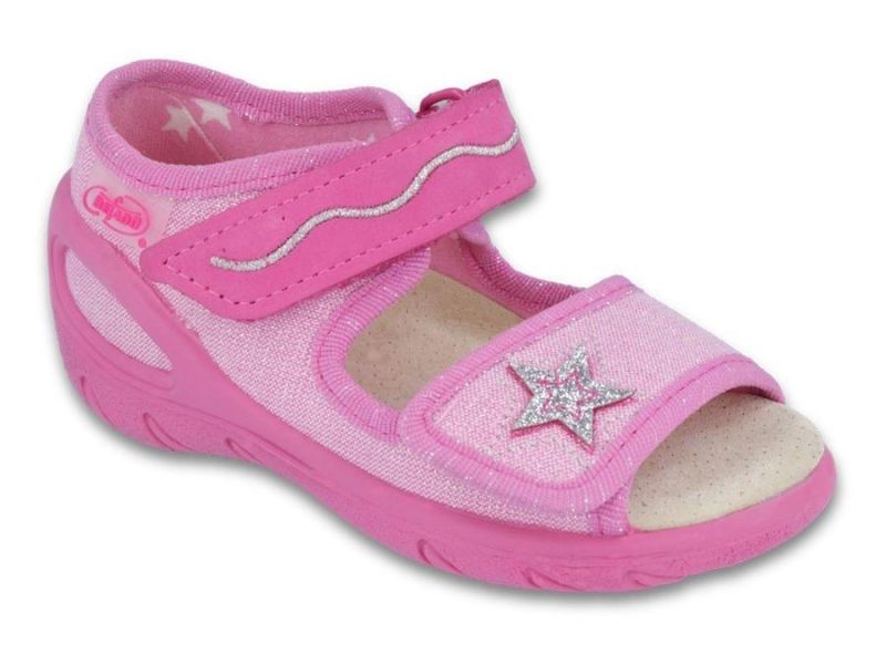 Бебешки сандали Befado Sunny 433X032 в розов цвят с принт на звезди. С кожена стелка със сводова опора, лека конструкция и удобни за ежедневни игри, градина и разходки.