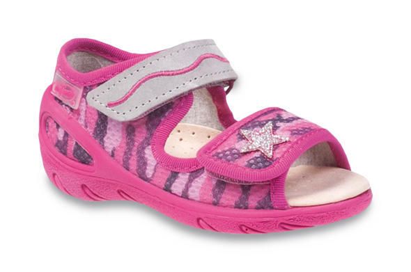 Бебешки сандали Befado Sunny 433X022 в цвят фуксия и звезден принт. С кожена стелка със сводова опора, лека конструкция и удобни за ежедневни игри, градина и разходки.