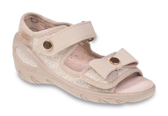 Бебешки сандали Befado Sunny 433X019 в бежов цвят и бляскав принт. С кожена стелка със сводова опора, лека конструкция и удобни за ежедневни игри, градина и разходки.