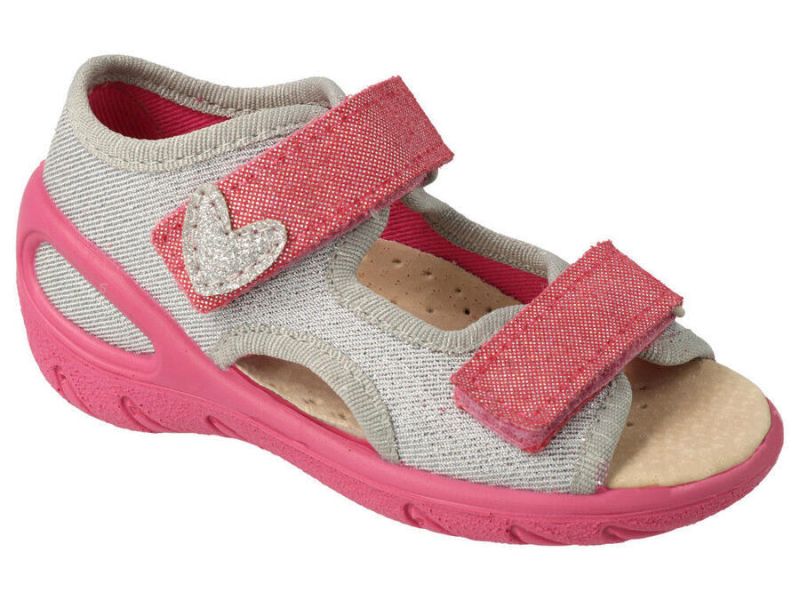 Бебешки сандали Befado Sunny 065X177 в сив цвят и принт на сърца. С кожена стелка със сводова опора, лека конструкция и удобни за ежедневни игри, градина и разходки.