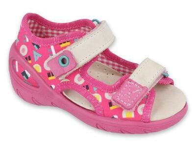 Бебешки сандали Befado Sunny 065X153 в цвят фуксия и цветен принт. С кожена стелка със сводова опора, лека конструкция и удобни за ежедневни игри, градина и разходки.